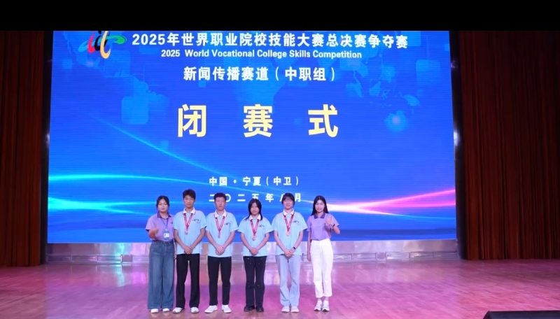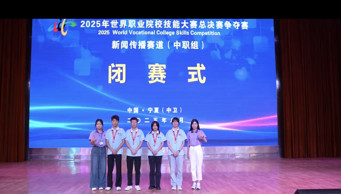 8月26日至29日,2025年世界职业院校技能大赛新闻传播赛道总决赛在宁夏回族自治区中卫市职业技术学校举行。来自全国68所中职院校的70支队伍参赛。济南信息工程学校康小庆、唐紫涵、刘子艺、张莹莹四位同学组成的参赛团队在王晗、王瑞雪两位老师指导下,团结协作、奋力拼搏,荣获铜奖。荣誉的取得,离不开师生四个月的共同备赛。回溯备赛历程,自接到参赛通知起,一场跨越四个月的 “攻坚战” 便悄然打响。指导教师主动放弃周末与假期,带领参赛团队开启 “朝八晚十” 的集训模式。这份执着的背后,离不开学校领导的鼎力支持,他们多次亲临集训现场慰问师生,了解备赛进度并协调解决困难。正是这样 “上下一心、内外联动” 的支持,让参赛团队得以心无旁骛地投入备赛,将压力转化为前进的动力。 比赛现场竞争激烈,参赛团队凭借扎实的专业基础从容应对。在内容策划环节,其方案因创意与可行性兼具,获得评委认可。团队成员配合默契,最终凭借稳定发挥和高质量作品,成功斩获铜奖。 此次获奖,既是师生备赛成果的体现,也印证了学校技能培养与实践教学的成效。未来,济南信息工程学校将以此次获奖为契机,深化教育教学改革,加强专业建设与师资培养,完善 “以赛育人、以赛促建” 模式,进一步提升学生综合素质,为社会输送更多技术技能人才。