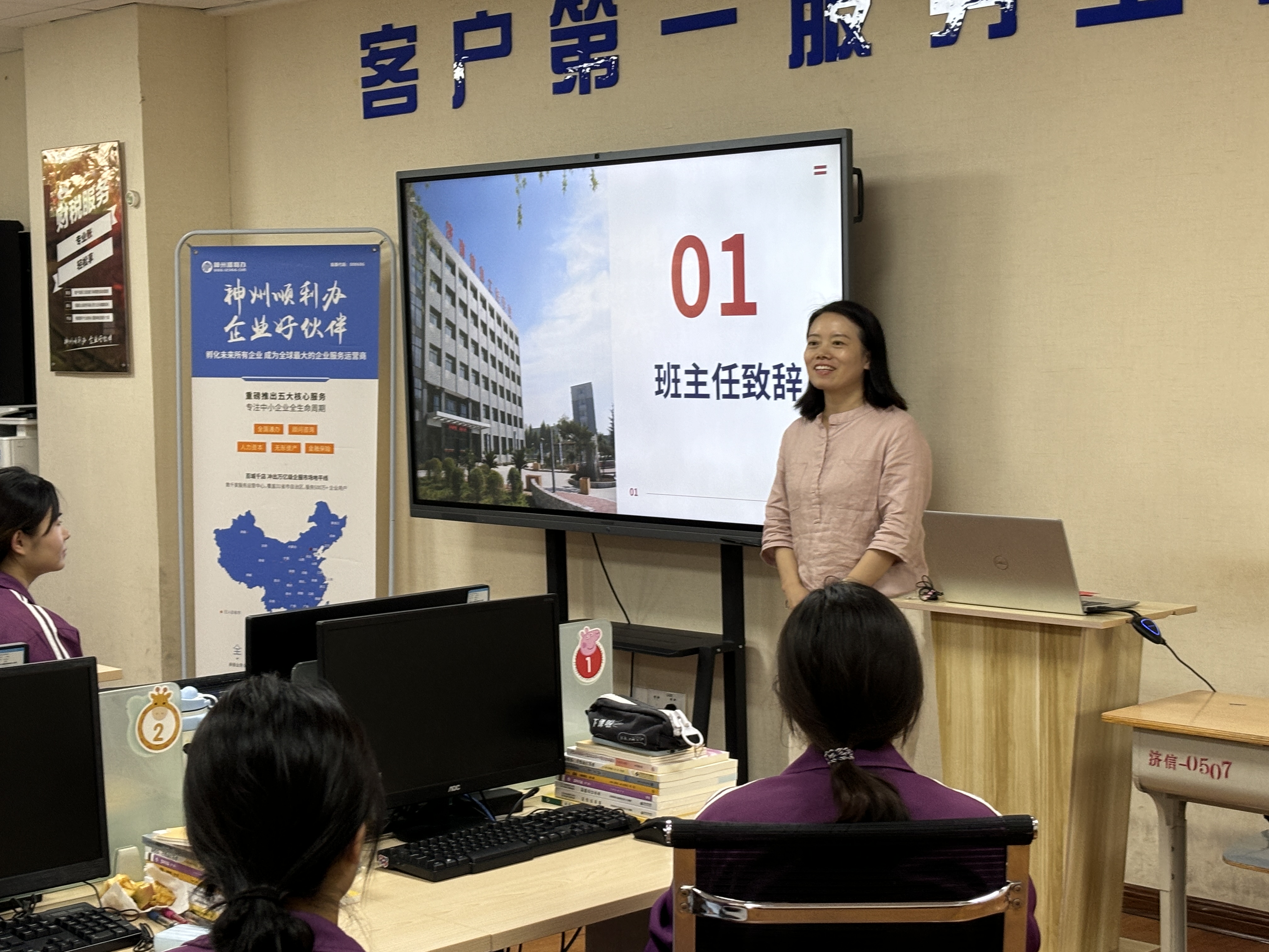 新起点、新期盼、新征程,由济南信息工程学校与山东神州顺利办校企合作的“智能财税工场”七期顺利开班,本次专班招生工作按计划分两阶段全面展开,最终招录40名新同学顺利成班。 在招生宣传阶段,专班制作了精美的宣传手册,详细介绍了专班的课程设置、师资力量、招生条件等内容。由王翠翠、李敏两位班主任老师利用班级群、班会进行广泛宣传,让同学们对智能财税专班有了深入认识,同学们纷纷踊跃报名。企业教师在线对学生进行面试,并解答学生的疑问。 9月4日下午,在智能财税工场专班教室举行了简短而隆重的开班典礼。典礼由企业方教师乜学灵老师主持,校方班主任宋丽娜、优秀毕业生代表孙梦瑶、职业素养张盈老师参加了典礼。 典礼伊始,主持人乜老师代表山东神州顺利办对第七期新生的到来表示热烈欢迎。她表示,智能财税工场始终致力于培养高素质、高技能的财税专业人才,希望同学们能够珍惜学习机会,努力提升自我,为实现梦想奠定坚实基础。随后,宋主任从国家职教举措及学校校企合作战略,专班师资、实训、技能素养双提升等方面进行发言,她表示专班超强的凝聚力可以让同学们快速地从初识到熟识相知,帮同学们坚定了加入专班的决心与信心,并对同学们的一年专班生活及未来发展规划提出了殷切希望。优秀毕业生代表孙梦瑶同学结合自身经历,分享了在智能财税工场的成长历程和就业经历。目前,刚刚参加实习工作两个月的她,已经在神州顺利办公司的审计部门,挑起了济南市政府以旧换新审计项目的大梁,负责和商务局对接审计进度及相应安排。她对工作的认真和负责,得到了领导们的一致好评。蔡晓菲同学作为新生代表进行发言。她分享道:“感谢学校智能财税工场专班,在这样的学习环境和条件下,我们可以更好地提升专业技能。接下来在专班里我要刻苦学习,努力考出初级会计职称证书,跟着企业老师学好专业知识和专业技能,以后更好地服务于社会”。